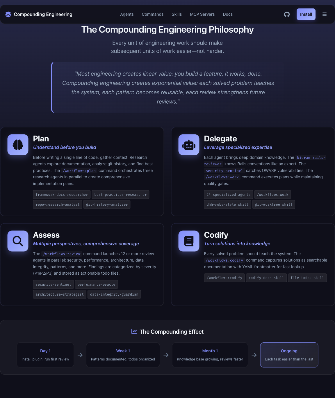 Design iterations (10x each) on all 10 sections: - Hero: Gradient headlines, animated eyebrow, enhanced buttons with shimmer - Stats: Icon system, gradient numbers, hover animations, layered shadows - Philosophy: Pillar cards with gradient borders, animated timeline, tool tags - Agents: Category headers with gradients, badge styling, code block enhancements - Commands: Terminal aesthetic with $ prompts, scanlines, CORE/UTIL badges - Skills: Knowledge module feel, feature pills, category theming - MCP Servers: Server-specific theming (teal/amber), ACTIVE badges, tool counts - Installation: Terminal-style code blocks, step progress indicators - FAQ: Card-based accordion, question/checkmark icons, smooth animations - CTA: Benefit-focused copy, animated badge, trust indicators, glass morphism Design inspired by Evil Martians devtool-template patterns. 🤖 Generated with [Claude Code](https://claude.com/claude-code) Co-Authored-By: Claude <noreply@anthropic.com>