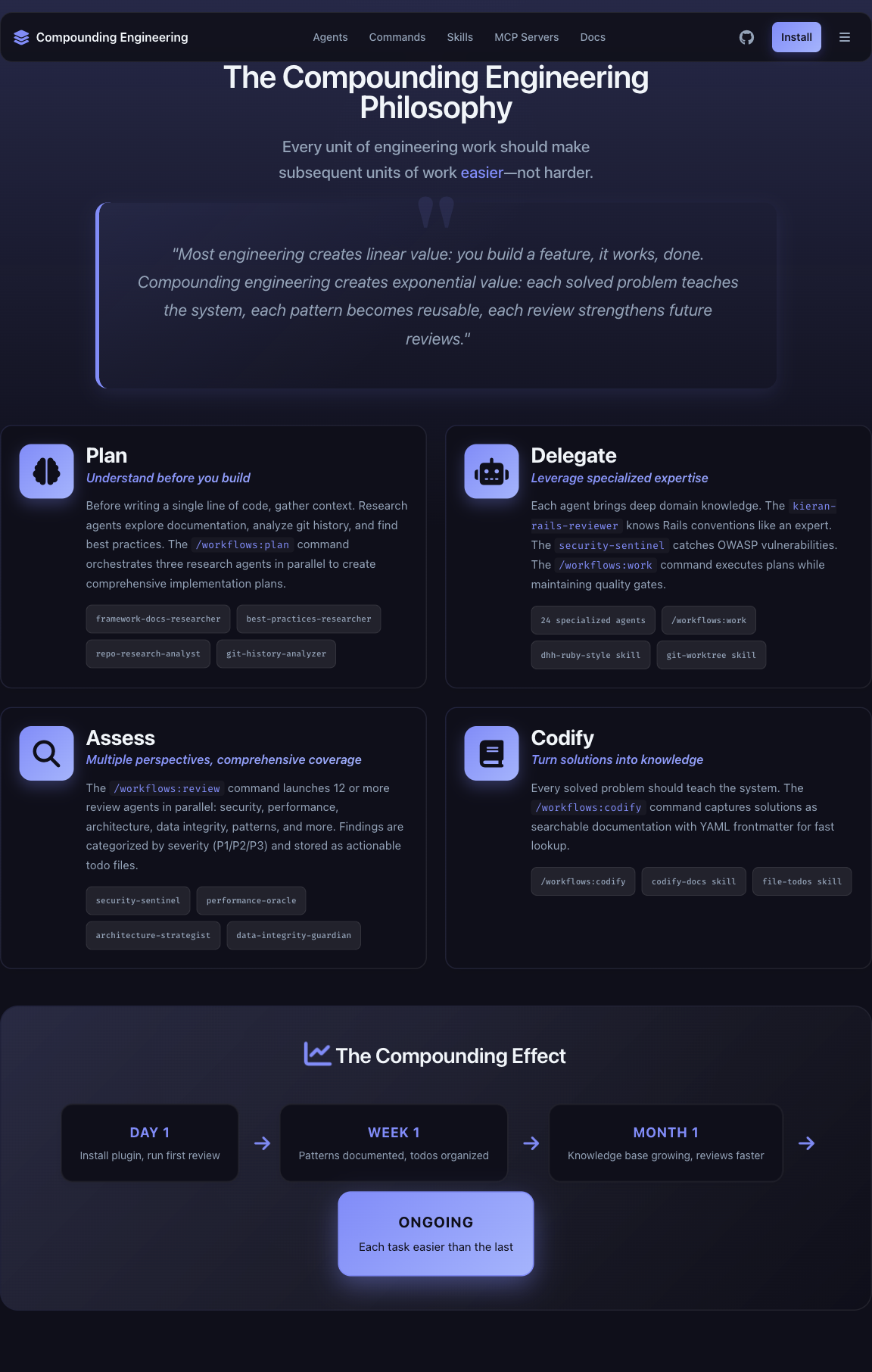 Design iterations (10x each) on all 10 sections: - Hero: Gradient headlines, animated eyebrow, enhanced buttons with shimmer - Stats: Icon system, gradient numbers, hover animations, layered shadows - Philosophy: Pillar cards with gradient borders, animated timeline, tool tags - Agents: Category headers with gradients, badge styling, code block enhancements - Commands: Terminal aesthetic with $ prompts, scanlines, CORE/UTIL badges - Skills: Knowledge module feel, feature pills, category theming - MCP Servers: Server-specific theming (teal/amber), ACTIVE badges, tool counts - Installation: Terminal-style code blocks, step progress indicators - FAQ: Card-based accordion, question/checkmark icons, smooth animations - CTA: Benefit-focused copy, animated badge, trust indicators, glass morphism Design inspired by Evil Martians devtool-template patterns. 🤖 Generated with [Claude Code](https://claude.com/claude-code) Co-Authored-By: Claude <noreply@anthropic.com>
